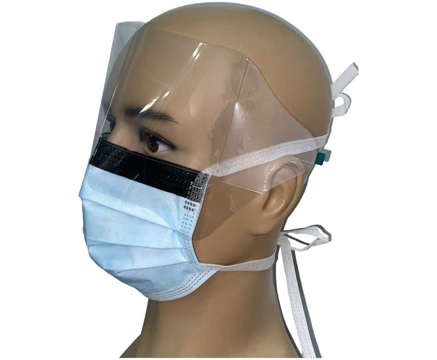The body of the mask is composed of three layers: the inner and outer layers are made of spun-bond polypropylene, the 2nd layer is made of melt blown polypropylene. The nose piece is made of Iron wire covered with polypropylene plastic, the ties are made of spun-bond polypropylene, and the visor is made of polyethylene terephthalate (PET).