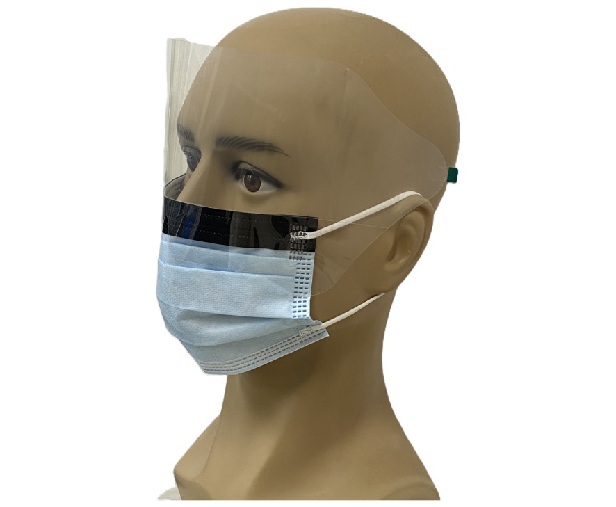 The body of the mask is composed of three layers: the inner and outer layers are made of spun-bond polypropylene, the 2nd layer is made of melt blown polypropylene. The nose piece is made of Iron wire covered with polypropylene plastic, ear loop is made of elastic band and the visor is made of polyethylene terephthalate (PET).